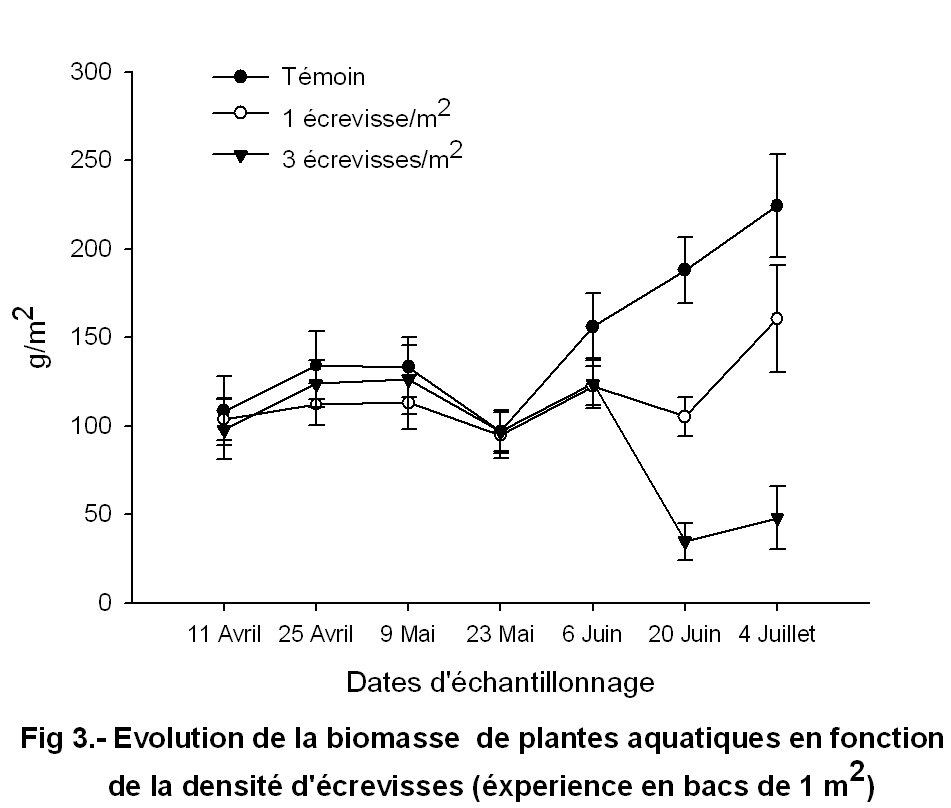 - The Louisiana red swamp crayfish strongly impacts aquatic vegetation. An experiment in tanks shows that aquatic plants are strongly impacted by the crayfish. The biomass of aquatic plants is 4 to 5 times lower in tanks stocked with a high density of crayfish (Figure 3) compared with the control (with no crayfish). This high density (3 crayfish / m2) is often found in Camargue habitats. It corresponds, however, to an ‘average’ density compared to what has been observed in other areas colonised by the Louisiana red swamp crayfish, such as Doñana and rivers in central Spain.