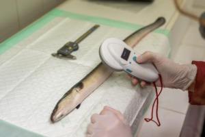 Pour répondre à ces questions, les équipes du projet ont mis en place un protocole de capture-marquage-recapture des anguilles. Chaque individu capturé lors des opérations de pêche est mesuré afin de déterminer son stade de développement, puis marqué selon un protocole prédéfini. L’individu est ensuite relâché dans son milieu naturel, où il pourra être détecté ultérieurement.